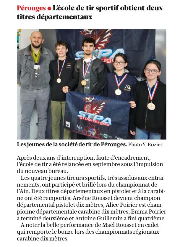 Après deux ans d'absence, la Société de Tir de Pérouges (STPA) signe un retour fracassant sur le devant de la scène. Sous l'impulsion de sa nouvelle équipe, les jeunes tireurs du club ont brillé lors des championnats de l'Ain avec deux titres départementaux :