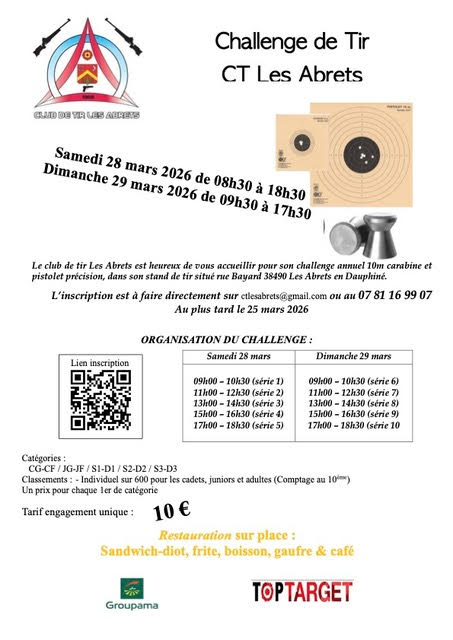 Amis tireurs et passionnés, le Club de Tir Les Abrets est ravi de vous inviter à son grand challenge annuel de tir à 10m (carabine et pistolet précision) !